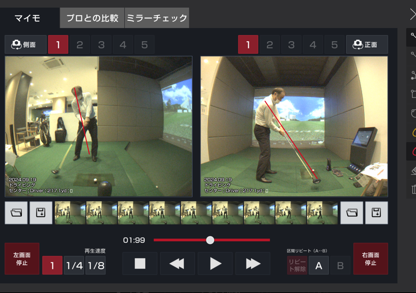 飛距離(キャリー、ラン)、ヘッドスピード、打球速度、スピン量などのデータのみならず、フェースの向き、クラブ軌道、ボール軌道、自身のスイングフォームなど、「ゴルフ練習」を様々な観点から「見える化」し、上達速度を早めます。